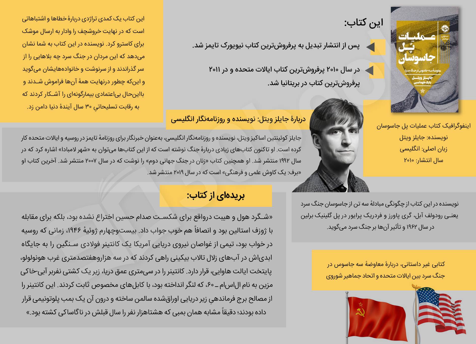|تبادل جاسوسان در واقع اذعان همۀ طرفها به جاسوسی بود.| سه جاسوسی که بر پل برلین معاوضه شدند چه کسانی بودند؟ روایتی از بیاعتمادی، پنهانکاری و ظرافتهای دنیای جاسوسی. جایلز ویتل از خلال مصاحبهها، اسناد و مدارک موجود از اولین و مهمترین تبادل جاسوسان میان شرق و غرب، تصویری حقیقی از جهان هولناک درگیر جنگ سرد ارائه میدهد که در آن همه مترصد نابودی طرف مقابل بودند. از متن کتاب
